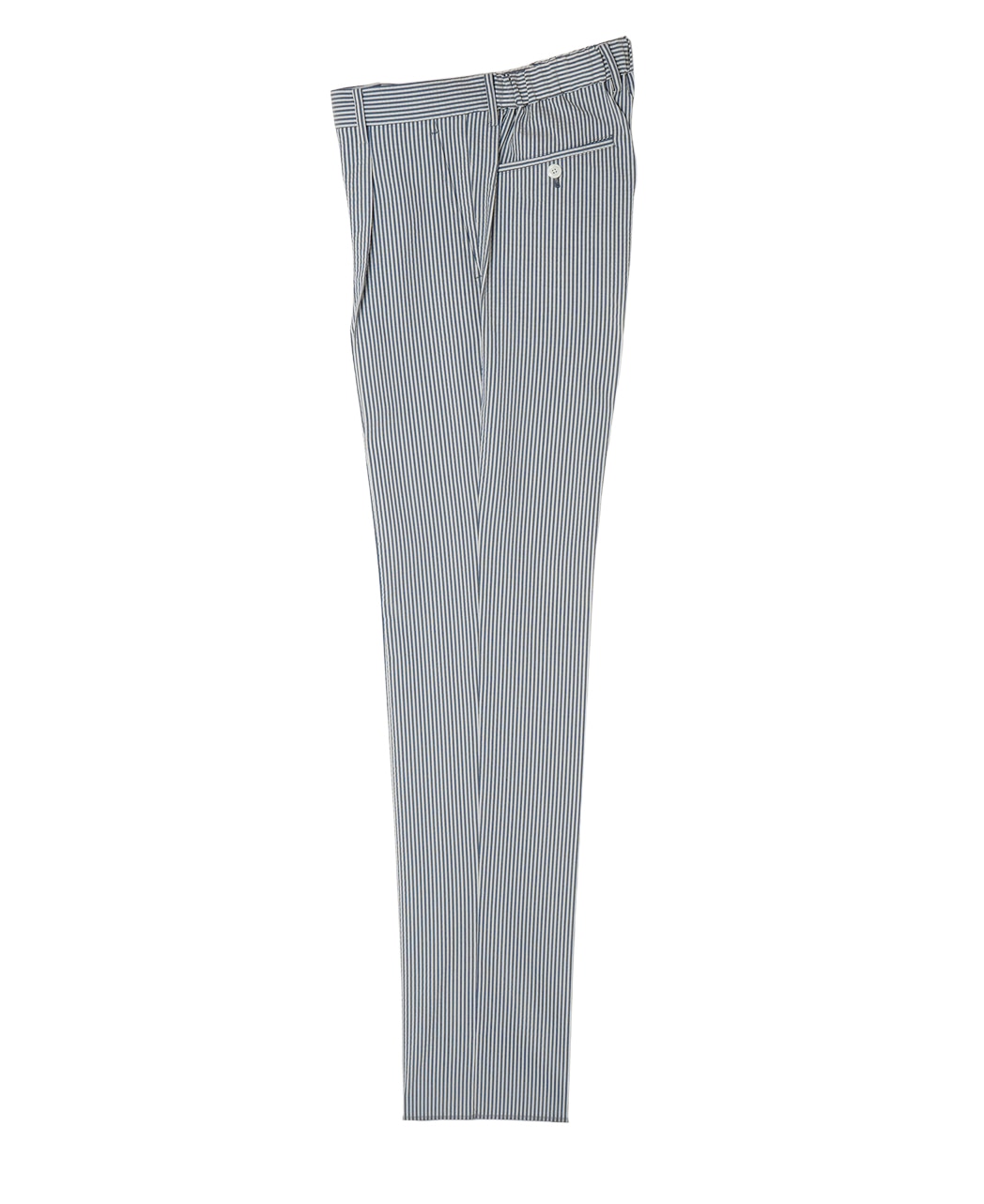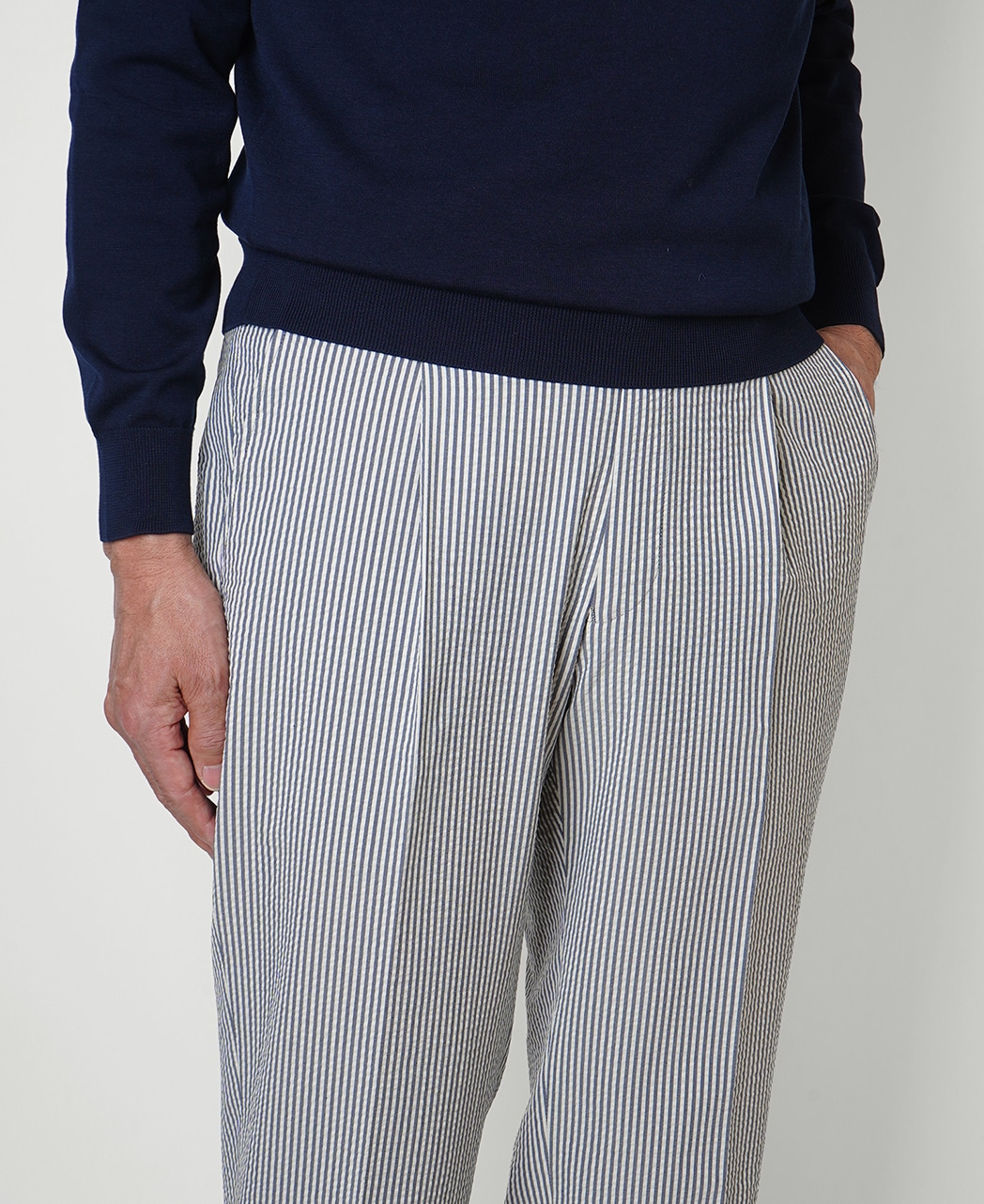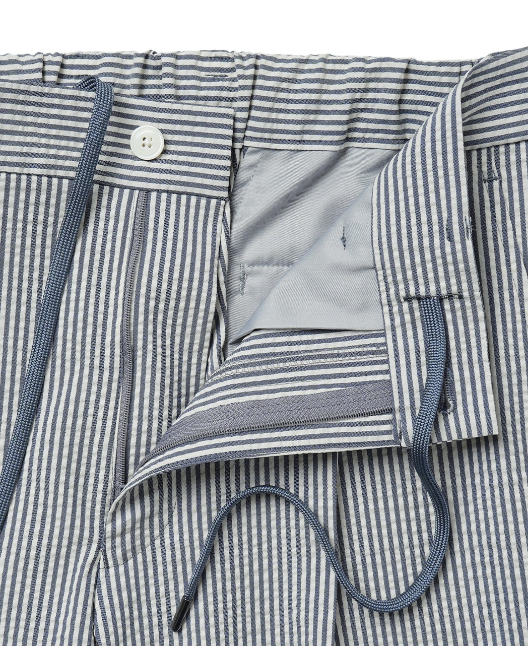 泡泡紗抽繩可搭配西褲,藍色系。泡泡紗(Seersucker)面料表面凹凸不平,減少與肌膚的接觸面積,帶來涼爽穿著感。搭配同系列外套可組成套裝。 材質:棉混紡 產地:日本